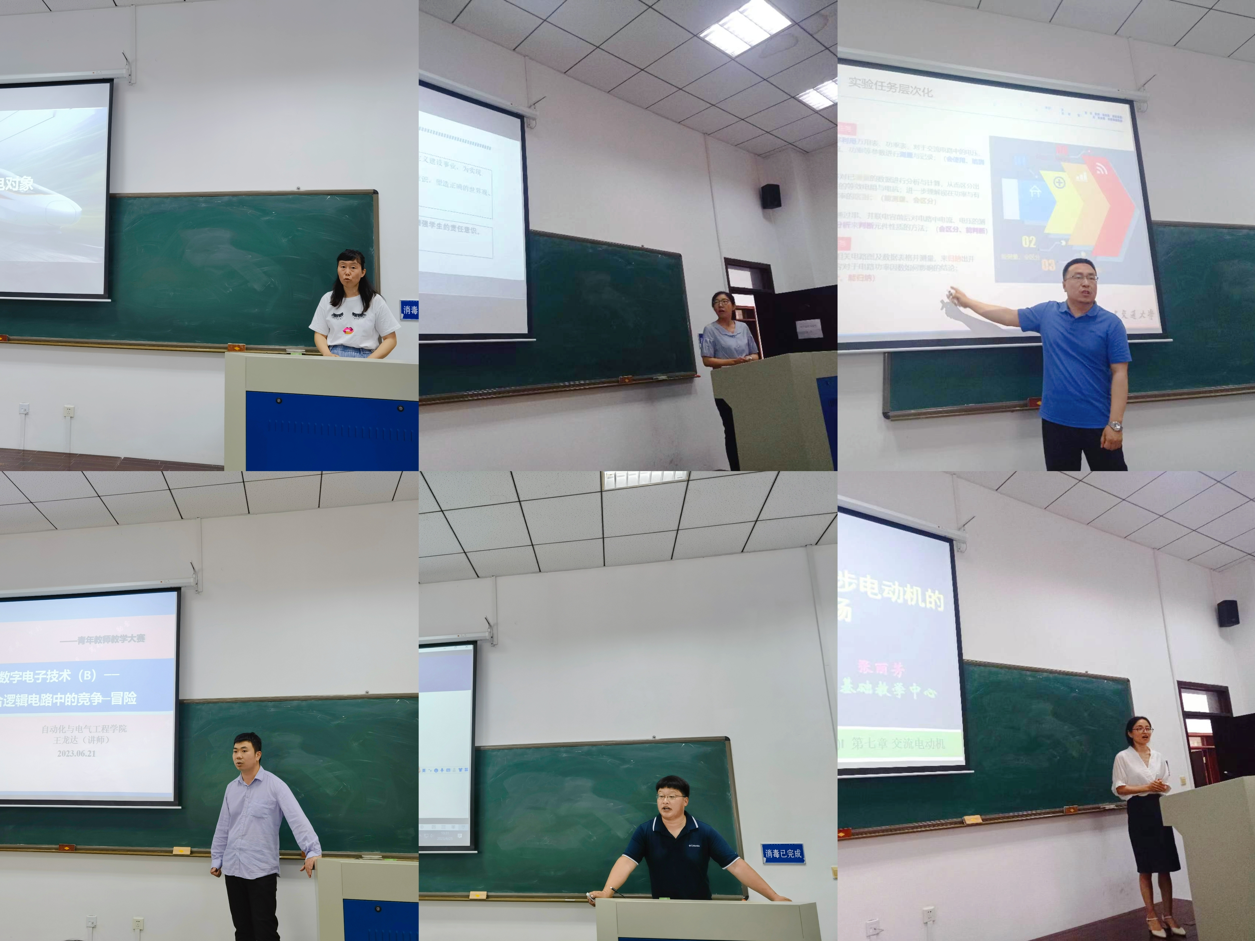 各系中心在对符合参评条件的30名青年教师进行初评后,确定推荐六名教师进入复评,他们分别是电气工程及其自动化系王娟娟、自动化系陈梦华、铁道信号与控制工程系王运明、和电基础教研中心刘晓博、王龙达、张丽芳。六名教师分别进行了《牵引供电系统》、《高速铁路信号系统》、《铁路信号基础设备》、《数字电子技术B》、《电工与电子技术AⅠ》和《电路原理实验》等六门课程的说课和授课展示。
