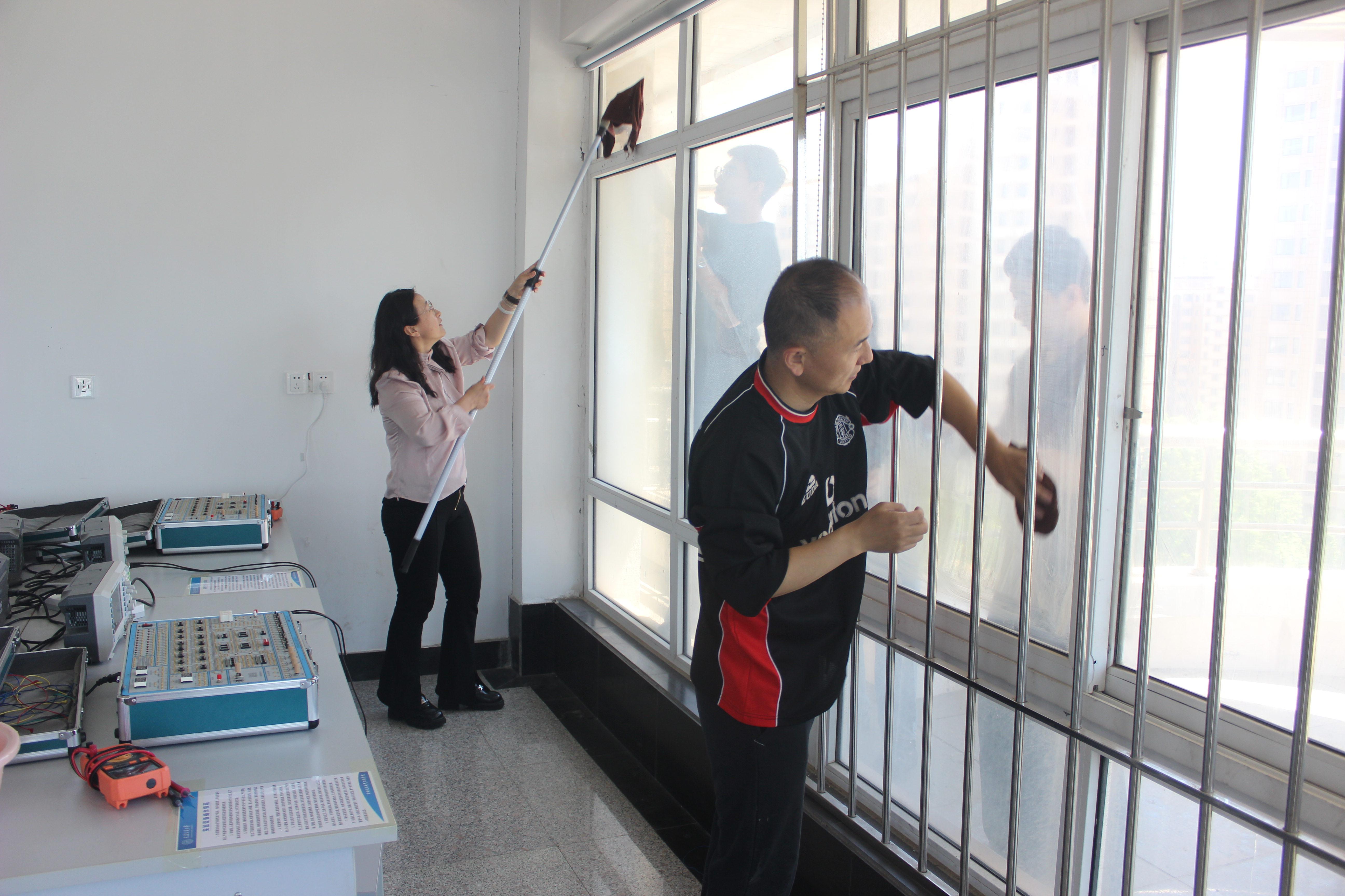 活动过程中,各系(中心)教职工、学生党支部党员分工明确,纷纷拿起滚刷、抹布等工具,对实验室进行认真清扫,尤其重点擦拭了实验室玻璃。大家热情高涨、密切合作,全身心地投入到劳动中,不怕脏、不怕苦、不怕累,从1楼到7楼,清洁打扫了单片机实验室、信号实验室、数电实验室等14间实验实训场所,全覆盖消灭实训楼卫生死角。经过大家共同努力,实验室面貌换热一新,地面、桌面干净整洁,试验设备摆放有序。在肉漫屋